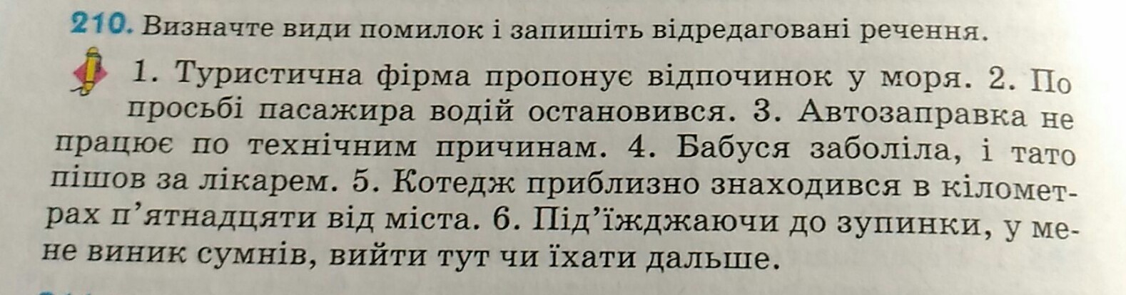 1 Туристична фірма пропонує відпочинок коло моря. 2 По проханню пасажира водій зупинився. 4 Бабуся захворіла, і тато пішов по лікаря. 5 Котедж знаходився приблизно в п'ятнадцяти кілометрах від міста. 6 Під'їжджаючи до зупинки я засумнівався, зійти тут, чи їхати далі?