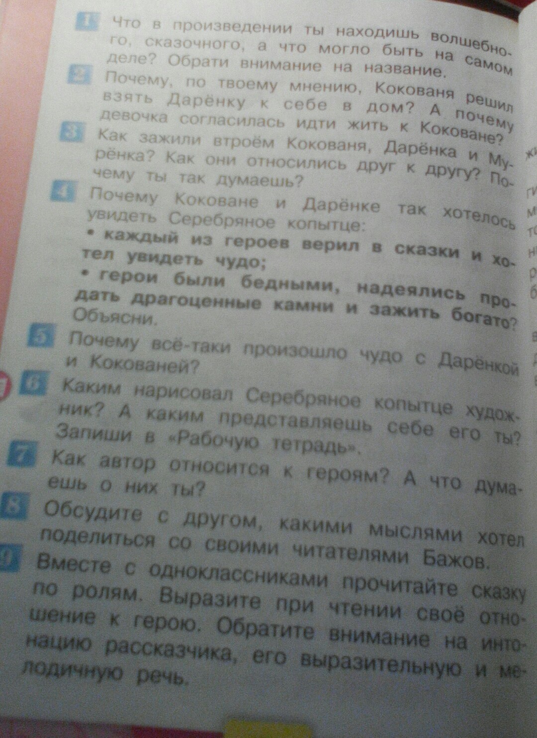 4) Коковане и Даренке хотелось увидеть Серебряное копытце, потому что каждый из героев верил в сказки и хотел увидеть чудо. Хотя жили они бедно, но к богатству во что бы то ни стало не стремились, для них главным было помогать друг другу, разделить одиночество. Поэтому когда они не нашли утром камней драгоценных, то не очень огорчились, опечалило их только то, что исчезли Серебряное копытце и кошка Муренка, которых они считали своими друзьями, которых успели полюбить.5) Чудо с Даренкой и Кокованей произошло потому, что они очень верили в него, нисколько не сомневались в волшебных свойствах Серебряного копытца, а еще потому что они были очень добрыми и бескорыстными, им не надо было богатств, им хотелось увидеть сказочное существо, возможно приручить его, приласкать, заботиться о нем, так же, как и друг о друге.