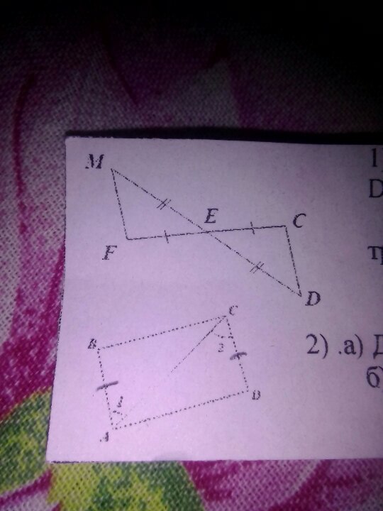 1) а) Так как ЕС=ФЕ, МЕ=ЕД, и так как угол МЕФ=СЕД(так как они вертикальные) , следовательно треугольники равны по двум сторонам и углу между ними