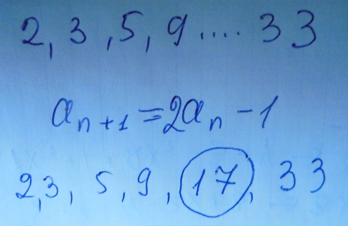 С помощью некоторым правилам задана последовательность чисел в которой отсутствует одно число 2 3 5 9 ... 33 оно заменено многотточием запишите отсутвующее число