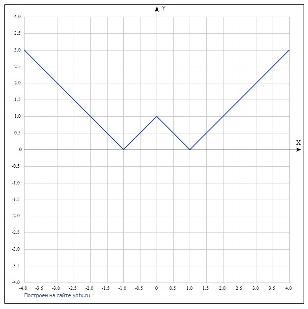 √((|x|-1)²) = | |x|-1|. Строим график у₁ = |x|-1. Получим 1 график,Это прямая у=х-1 при неотрицательных х и ее отражение в левую полуплоскость.