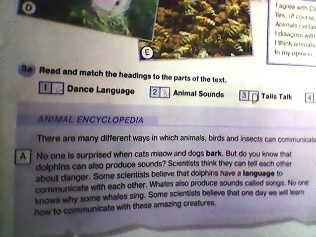 Никого не удивит то, что кошки мяукают и собаки гавкают. Но знали ли вы, что дельфины также могут производить звуки? Ученые думают, что они могут предупредить друг друга об опасности. Также некоторые ученые верят, что дельфины имеют язык общения друг с другом. Киты также производят звуки, называемые "песнями". Никто не знает почему киты поют. Некоторые ученые верят, что однажды мы узнаем(?) (плохо видно) как общаться с этими потрясающими существами.