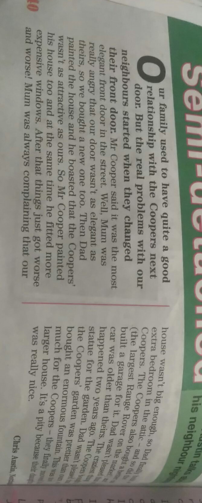 У нашей семьи были хорошие отношения с соседними Куперами. Но реальные проблемы с нашими соседями начались, когда они сменили входную дверь. Г-н Купер сказал, что это самая элегантная парадная дверь на улице. Ну, мама была очень сердита, что наша дверь была не такой изящной, как у них, поэтому мы тоже купили новую. Затем отец написал дом, и он похвастался тем, что Куперс был не таким привлекательным, как наш. Итак, мистер Купер тоже написал свой дом, и в то же время он установил более дорогие окна. После этого все ухудшилось хуже! Мама всегда жаловалась, что дом достаточно большой, поэтому дополнительная спальня в (The Coopers als построила самый большой Range Rover для гаража для нее. Папа-машина была старше, чем их произошло два года назад. Статуя для сада. Огромный размер для Куперса, которого они добились, был действительно жалким, потому что славный Крис Остин,