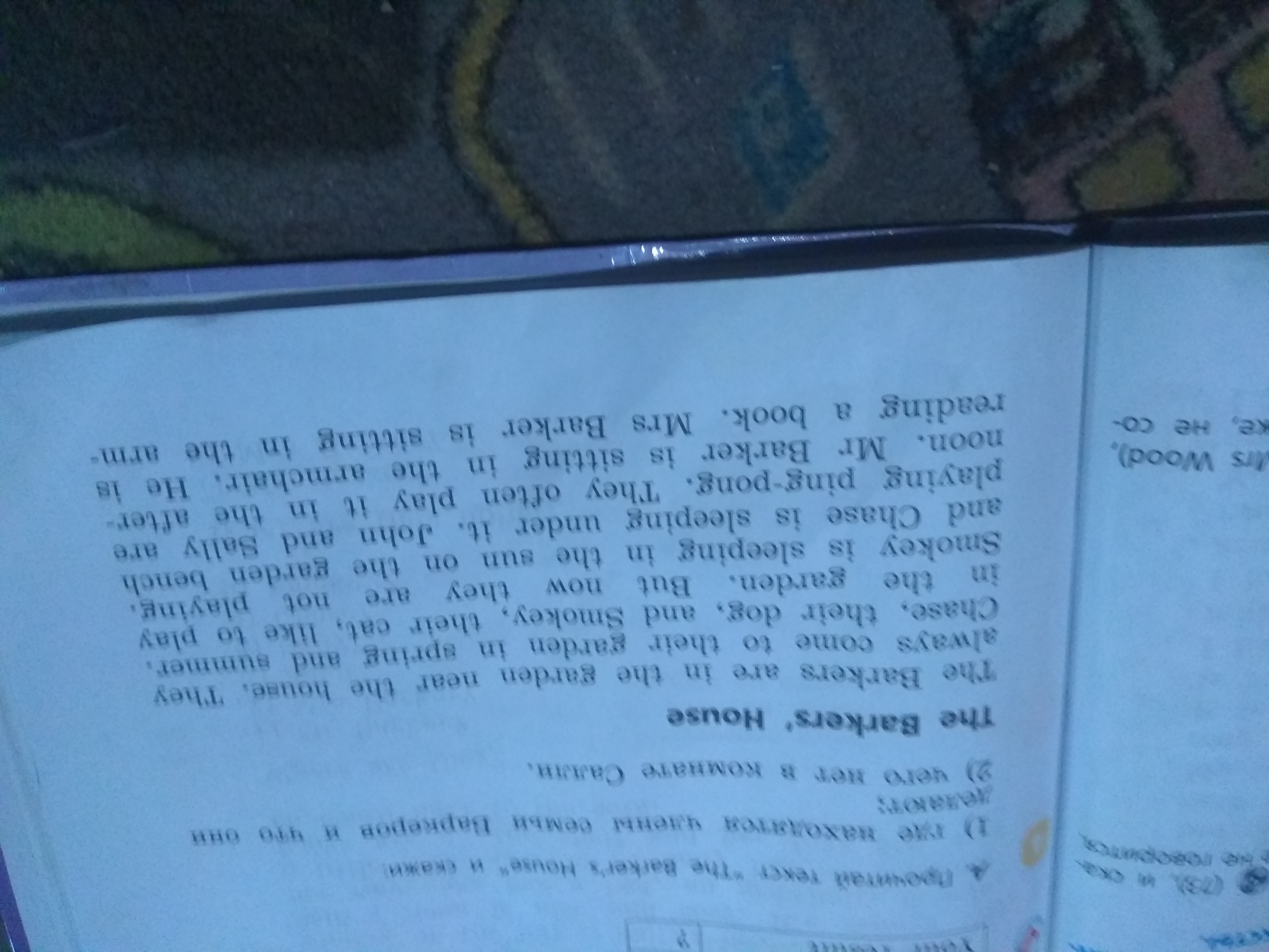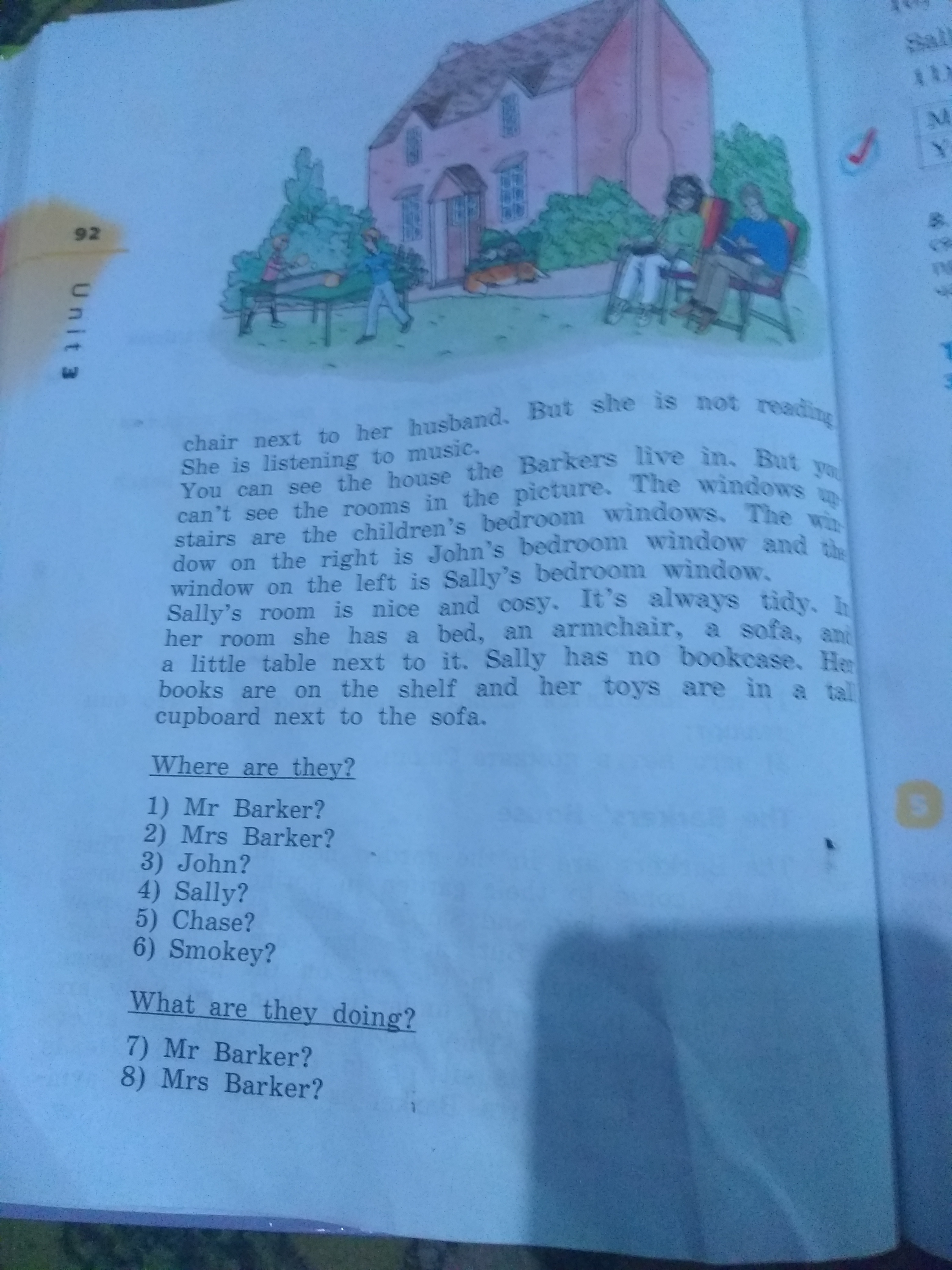 Баркерс находится в саду рядом с домом. Они всегда приходят в свой сад весной и летом. Чейз, их собака и Смоки, их кошка, любят играть в саду. Но теперь они не играют. Смоки спит на солнце на скамейке в саду, и Чейз спит под ним. Джон и Салли играют в настольный теннис. Они часто играют в них после полудня. Мистер Баркер сидит в кресле. Он читает книгу. Миссис Баркер сидит в кресле рядом с мужем. Но она не читает. Она слушает музыку.Вы можете видеть дом, в котором живут Баркерс. Но вы не видите комнаты на картинке. Окна вверх по лестнице - это окна детской спальни. В правой части окна справа находится окно спальни Джона, а окно слева - окно спальни Салли.Комната Салли приятная и уютная. Это всегда аккуратно. В ее комнате у нее есть кровать, кресло, диван и столик рядом с ним. У Салли нет книжного шкафа. Ее книги находятся на полке, а ее игрушки находятся в высоком шкафу рядом с диваном