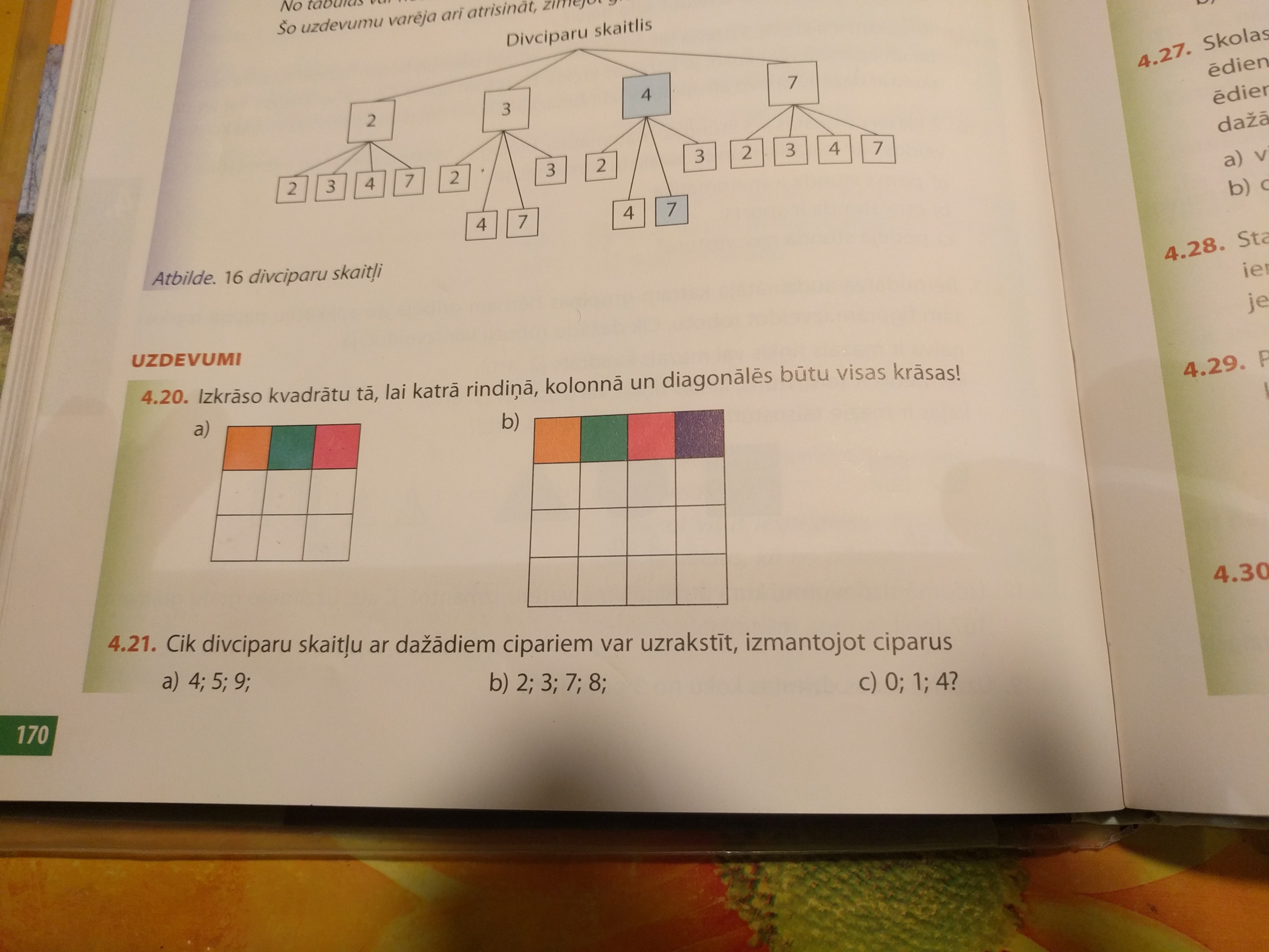 4.20. зарисовать квадраты так, чтобы в столбике, в ряду и по диагонали цвета не повторялись.