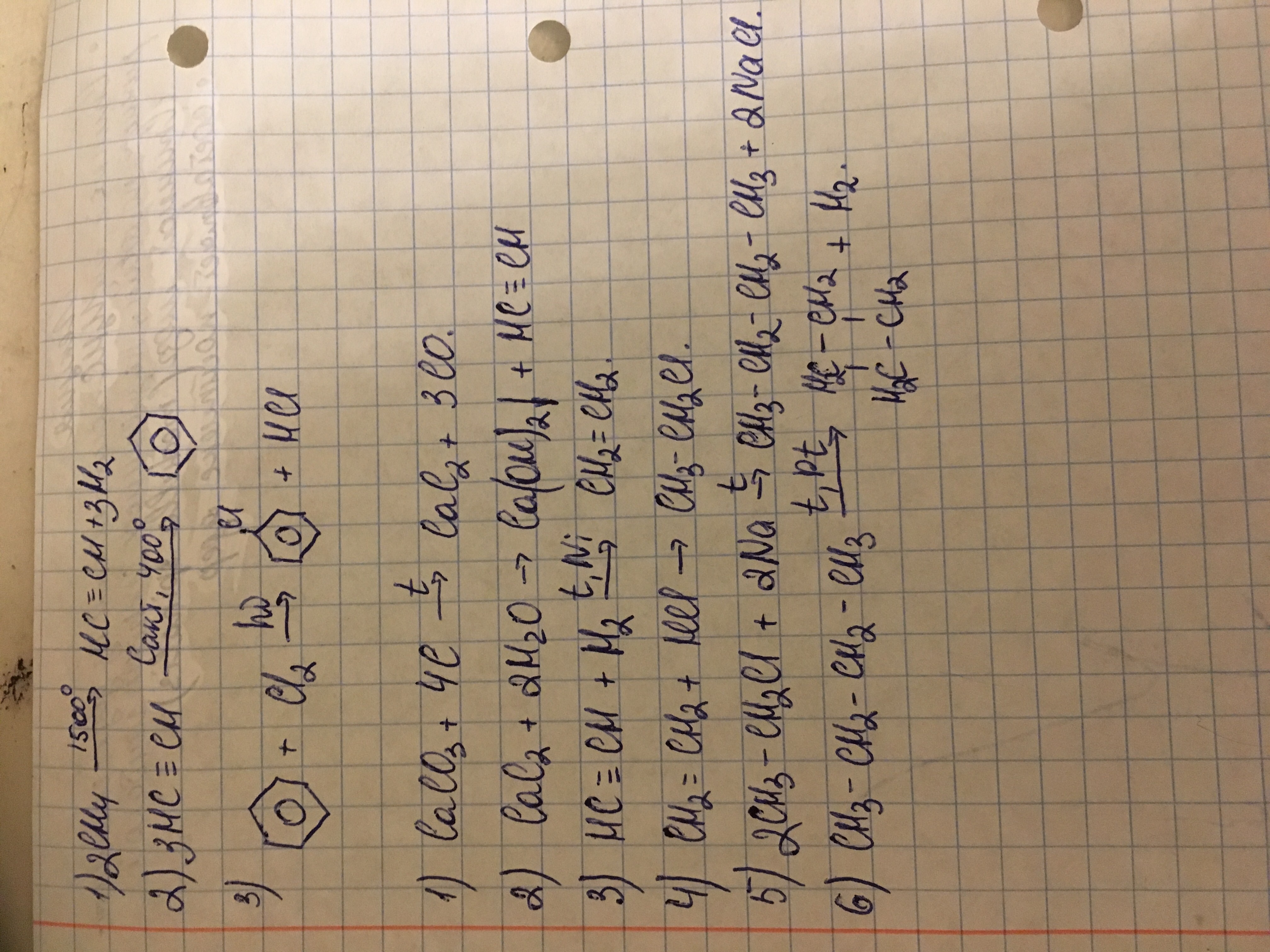 напишите уравнения реакций, при помощи которых можно осуществить следующие превращения: 1) CH4 - C2H2 - C6H6- C6H5CL 2) Caco3 - Cac2- C2H2- C2H4 - C2H5CL - ,бутен - циклобутан.