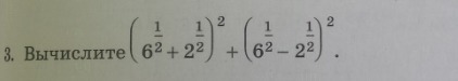 displaystyle  bigg(6^{ frac{1}{2}}+2^{ frac{1}{2}}bigg)^2+bigg(6^{ frac{1}{2}}-2^{ frac{1}{2}}bigg)^2=bigg(6^{1/2*2}+2*(6*2)^{ frac{1}{2}}+2^{1/2*2}bigg)+\\+bigg(6^{1/2*2}-2*(6*2)^{ frac{1}{2}}+2^{1/2*2}bigg)=\\=bigg(6+2(12)^{1/2}+2bigg)+bigg(6-2(12)^{1/2}+2bigg)=\\=8+2*(12)^{1/2}+8-2*(12)^{1/2}=16