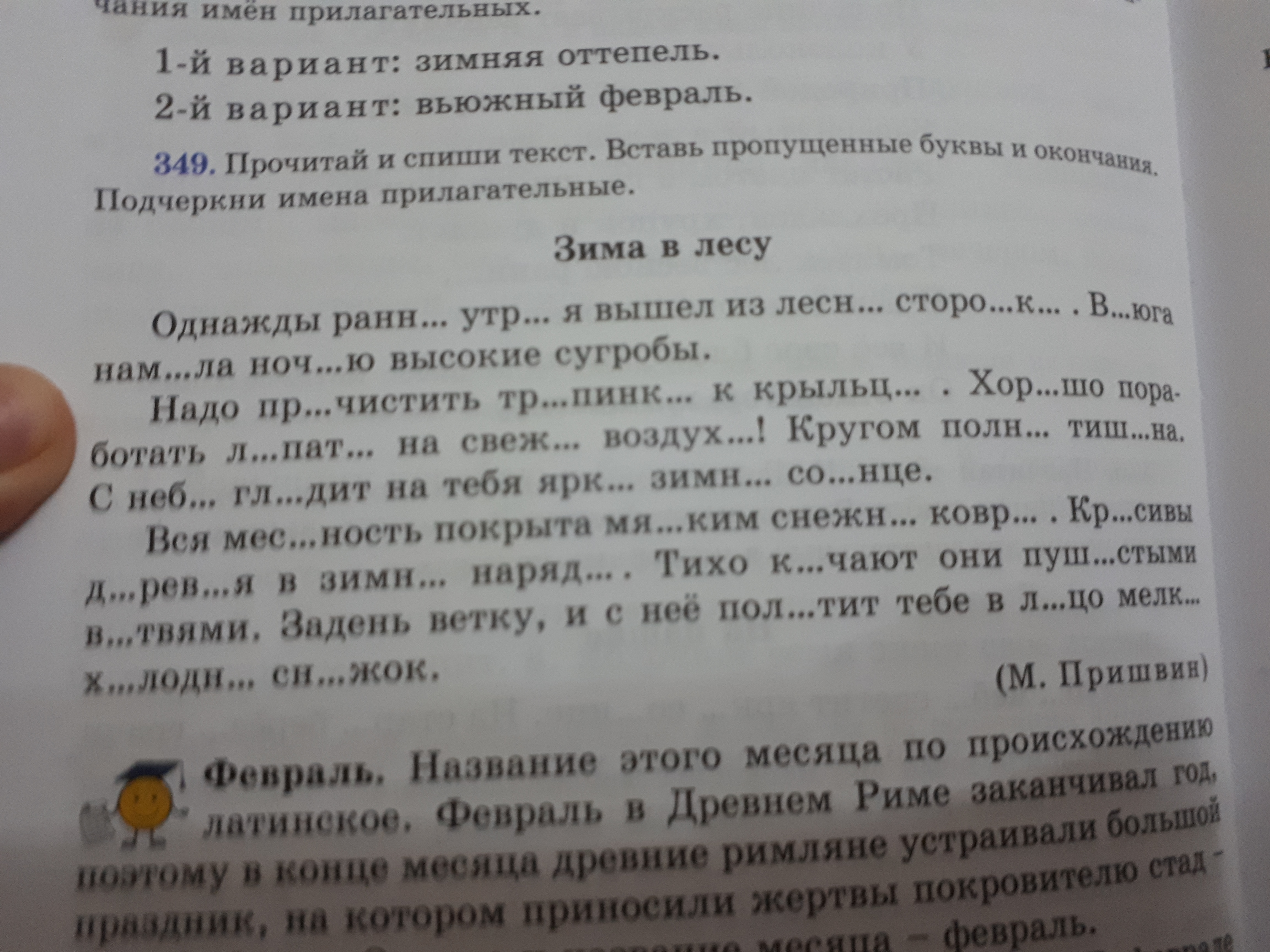 Однажды ранним утром я вышел из лесной сторожки. Вьюга намела ночью высокие сугробы. Надо прочистить тропинку у крыльца. Хорошо поработать лопатой на свежем воздухе! Кругом полная тишина. С неба глядит на тебя яркое зимнее солнце. Вся местность покрыта мягким снежным ковром. Красивы деревья в зимнем наряде. Тихо качают они пушистыми ветвями. задень ветку, и с нее полетит тебе в лицо мелкий холодный снежок.