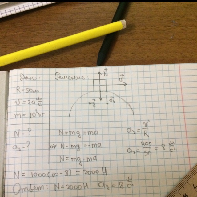 По выпуклому мосту с радиусом 50 м движется автомобиль со скоростью 72 км/ч. Масса автомобиля равна 1 т. Определить с какой силой автомобиль давит на мост и какое ускорение имеет автомобиль в верхней точке моста? РЕШИТЕ ПОЖАЛУЙСТА БУДУ очень благодарен)