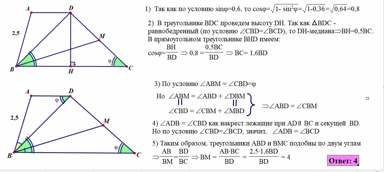 Дана трапеция ABCD. На боковой стороне CD отметили точку M так, что ∠ABM=∠CBD=∠BCD=φ. Известно, что AB=2,5 и sinφ=0,6. Чему равна длина отрезка BM?