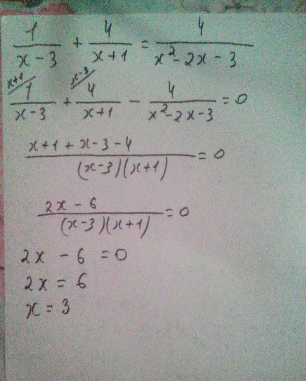 В следующем этапе находим общий знаменатель, делим общий знаменатель на знаменатель каждой дроби в уравнении, домнажаем числитель каждого выражения и считаем. Получим 3, но это еще не все, мы должны узнать подходит ли это значение нам, смотрим на общий знаменатель и подставляем 3 вместо икса, если при вычислении получился ноль, а на ноль делить нельзя, то в этом случае решений нет