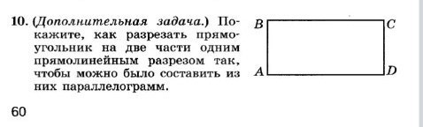 Покажите,как разрезать прямоугольник на две части одним прямолинейным разрезом так, чтобы можно было составить из них параллелограмм