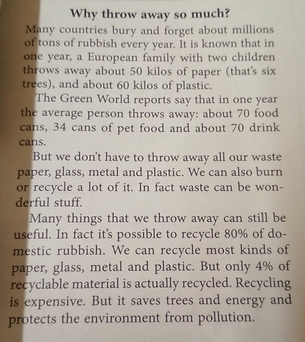 This text tells about pollution of the environment because of rubbish. People throw away a lot of waste like cans, glass, paper etc. This rubbish can be useful stuff in different spheres of life. People can recycle all of this material to save the environment, but they can't do this because of high expenses of the recycling.