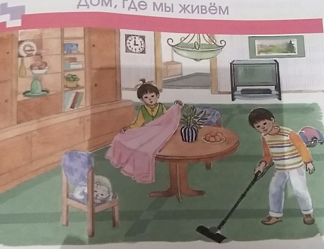 Меня очень удивила эта картина она очень красочная и позитивная . На картине изображены мальчик с девочкой убираются в комнате . Котик спит на стуле , а девочка застилает скатертью стол а мальчик пылисосит в комнате .