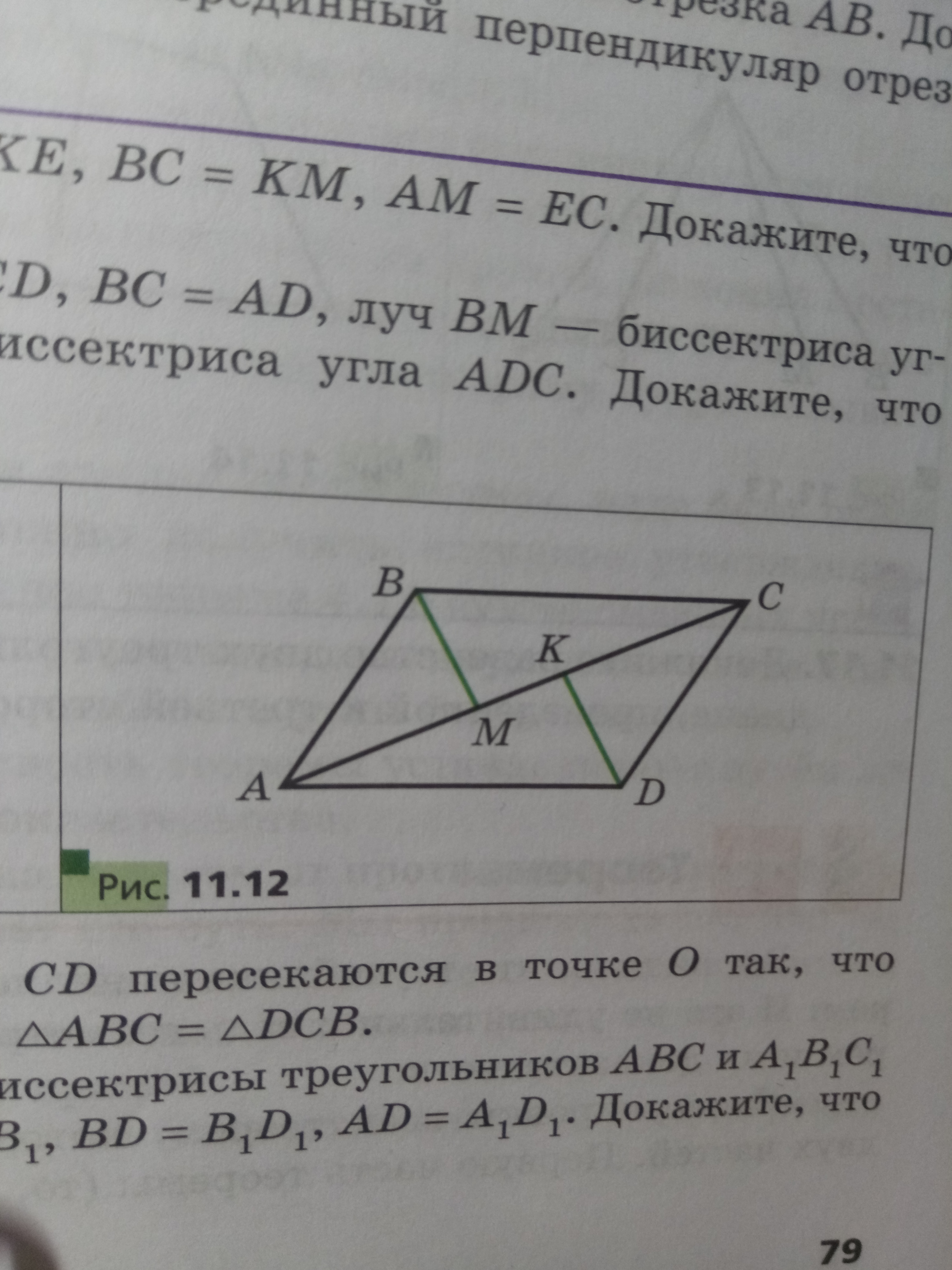 На рисунке 11.12 AB = CD, BC = AD, луч ВМ - биссектриса угла AВС, луч DK - биссектриса угла АDC. Докажите, что ΔАВМ = ΔСDK