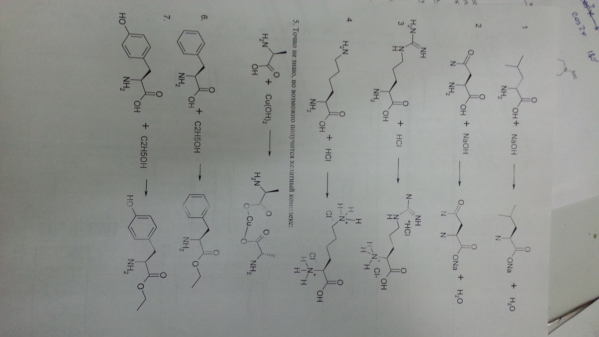 1. D-Лейцин + гидроксид натрия 2. Аспаргиновая кислота + избыток гидроксида натрия 3. L-аргинин + соляная кислота 4. Лизин + избыток соляной кислоты 5. Аланин + Cu(OH)2 6. Этерификация фенилаланина 7. Этерификация тирозина
