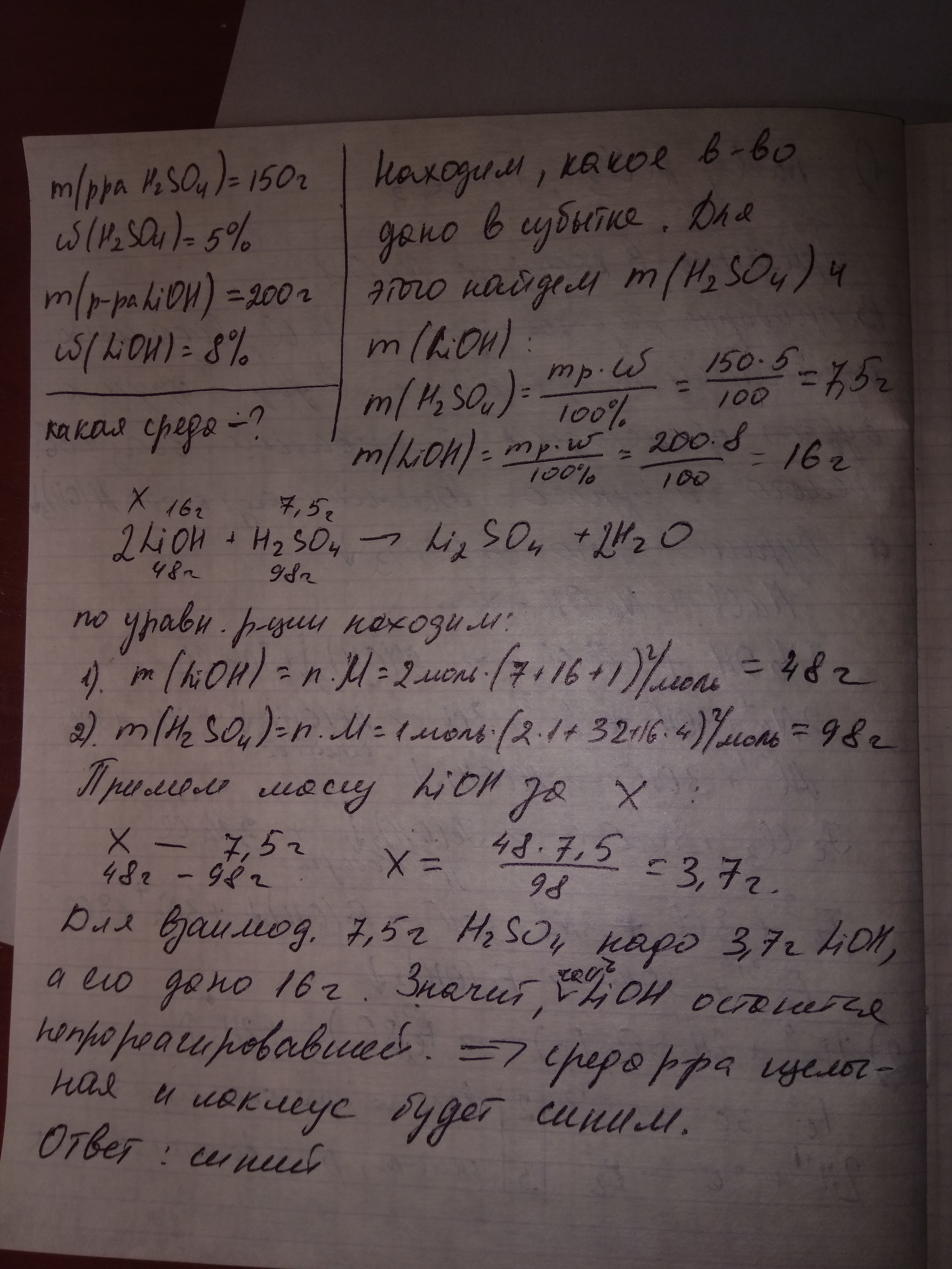 какую реакцию на лакмус будет иметь раствор, полученый при сливании 150г 5% раствора H2SO4 и 200г 8% раствора LiOH