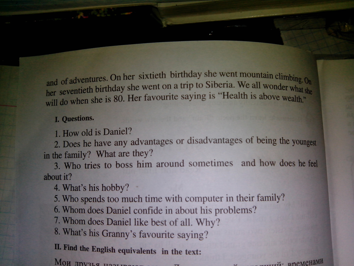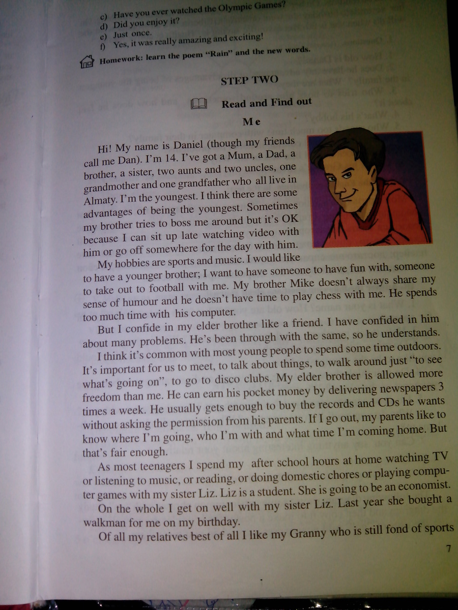 Привет! Меня зовут Даниэль (хотя друзья зовут меня Дэн).Мне 14. У меня есть мама, папа, брат, сестра, две тети и два дяди, одно бабушка и один дедушку, которые живут а Алмате. Я младшая. Я думаю это преимущество быть самой маленькой.Иногда мой брат пытается построить меня, но это ничего, потому что я могу до позна смотреть с ним видео (фильмы) или пойти с ним куда-нибудь на весь день. Мои хобби спорт и музыка. Я бы хотел иметь младшего брата. Я хочу чтобы был кто-нибудь с кем можно повеселиться, кого-нибудь кто поиграет со мной в футбол. Мой брат Майк не разделяет мое чувство юмора и у него нет времени играть со мной в шахматы. Он проводит слишком много времени за компьютером.