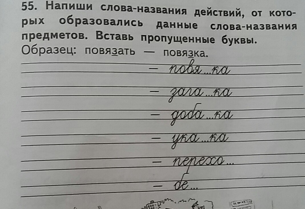 Напиши слова наaaания действий, от кото- рых образовались данные слова-названия пропущенные буквы. предметов. Вставь