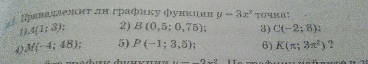 принадлежит ли графику функции y=3x в квадрате точка: 1) A(1;3), B(0.5;0.7) C(-2;8) M(-4;48) P (-1;3.5) K(p;3p(в квадрате))