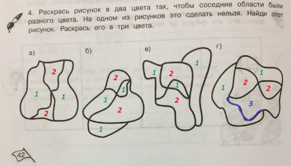Раскрась рисунок в два цвета так чтобы соседние области были разного цвета на одном из рисунков это сделать нельзя найди этот рисунок раскрасить его в три цвета.