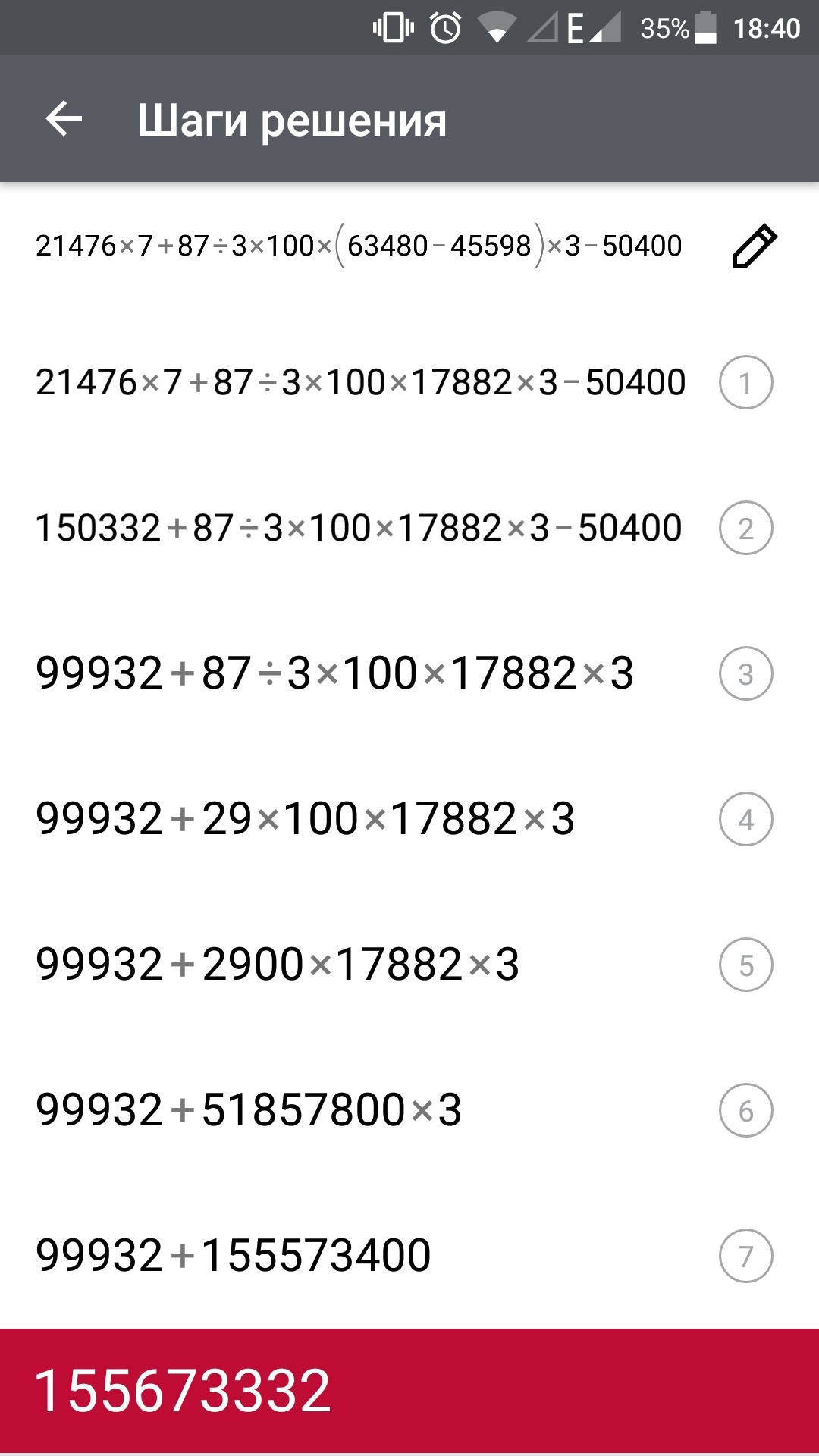 21476 * 7 + 87 : 3 * 100 (63 480 - 45598) * 3 - 50400