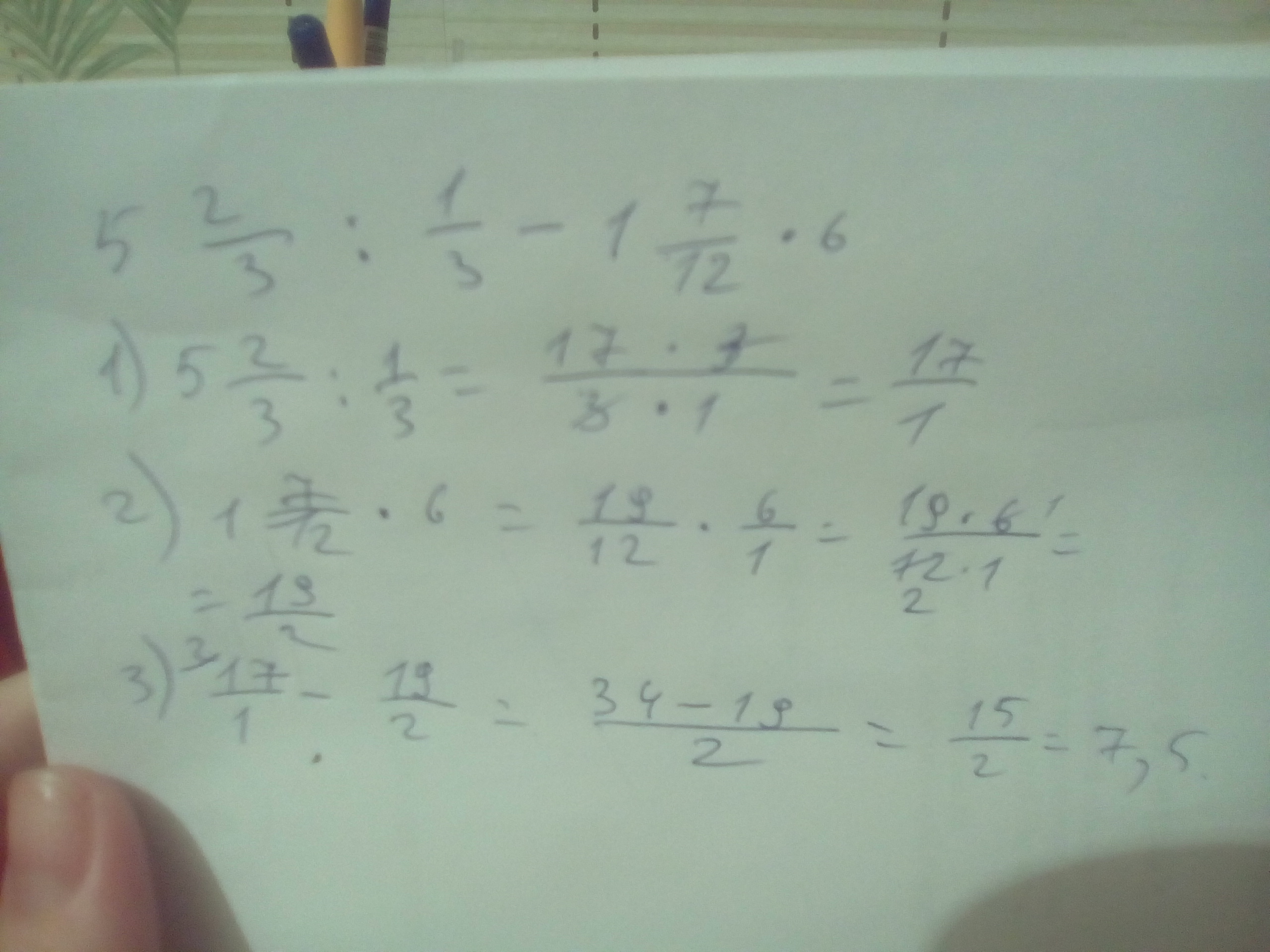 пять целых две третьих делать на одну третью минус одна целая семь двенадцатых умножить на шесть ( помогите решить! )