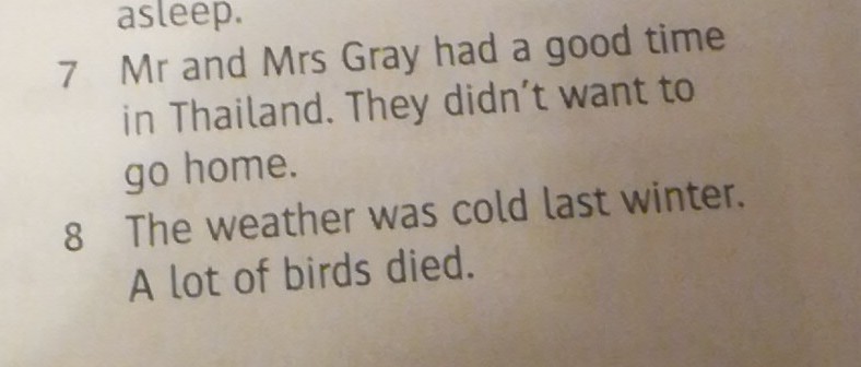 7)Мистер и Мисис Грей хорошо провели время в Таиланде.Они не хотели идти домой. 8)Погода біла холодной прошлой зимой.Много птиц умирало