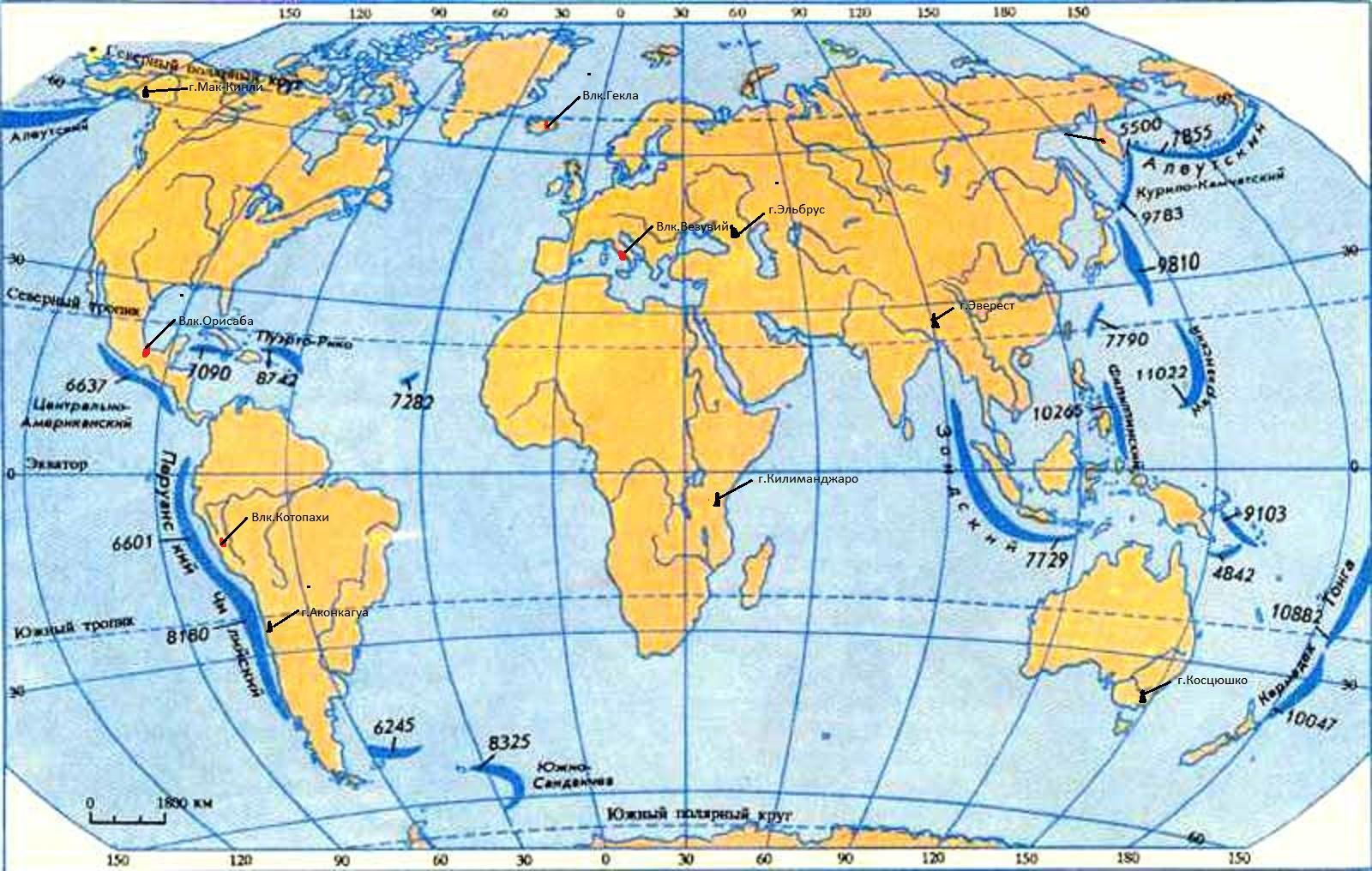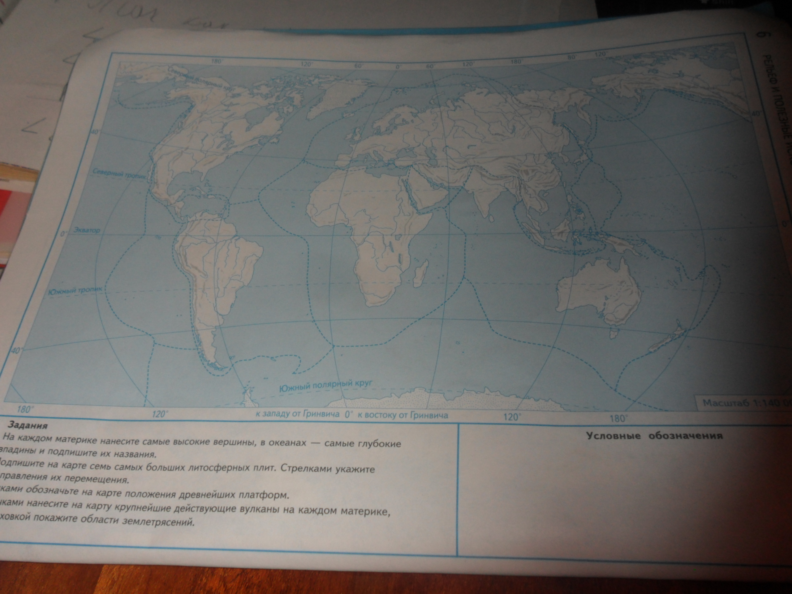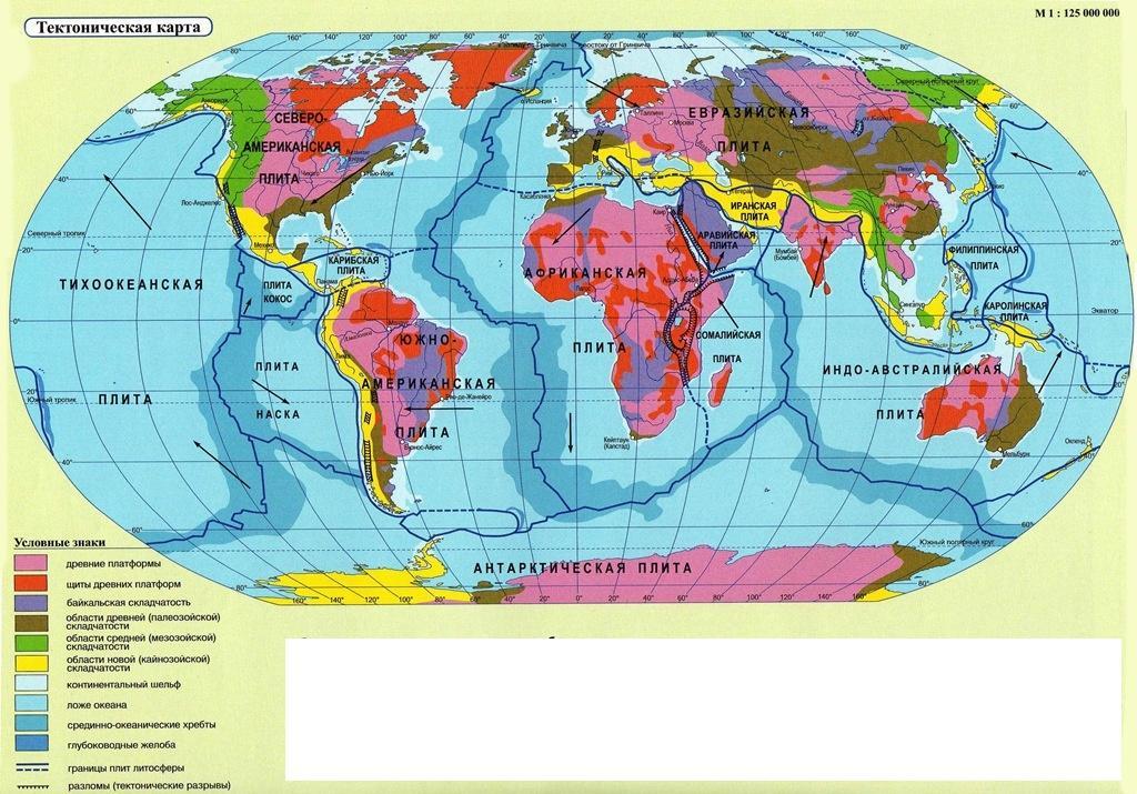 Если ни видно. НА каждом материке нанесите самые высокие вершины, в океанах - самые глубокие впадины и подпишите их названия. 2 Подпишите на карте семь самых больших литосферных плит. Стрелками укажите направления их перемещение. 3 Точками обозначьте на карте положения древнейших платформ.