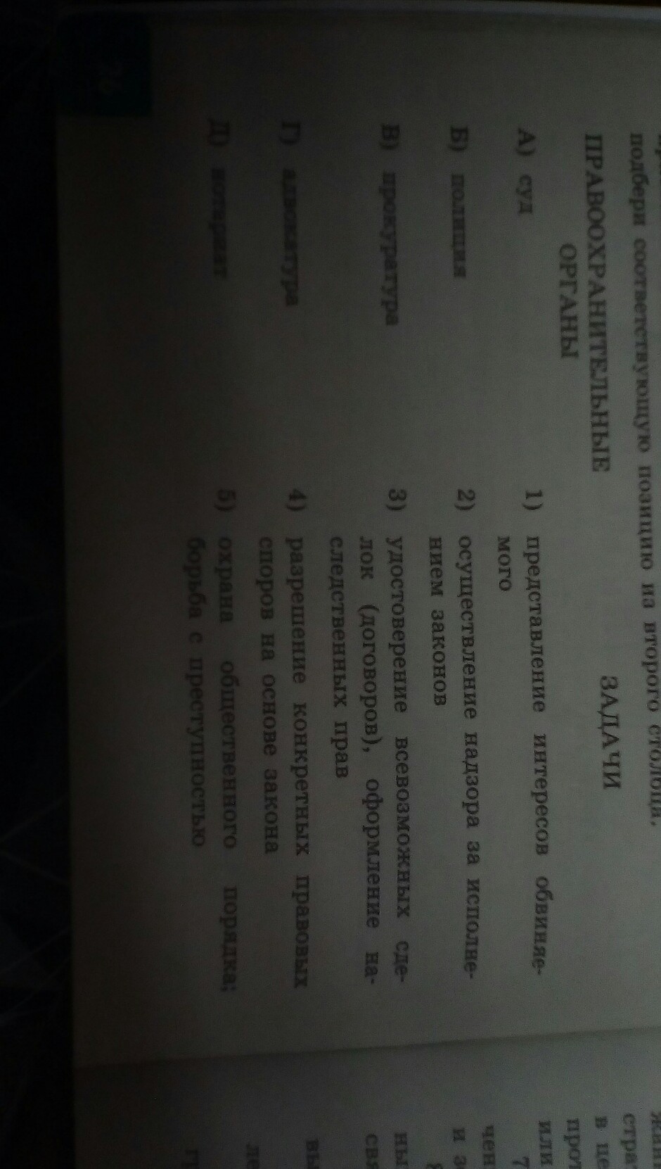 соотнеси правоохранительные органы и задачи,которые они призваны выполнять: к каждой позиции данной в первом столбце, подбери соответствующую позицию из второго столбца.
