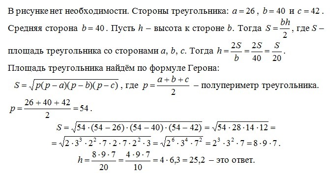 дан треугольник со сторонами 26 40 и 42 найдите длину высоты проведённой к средней стороне треугольника