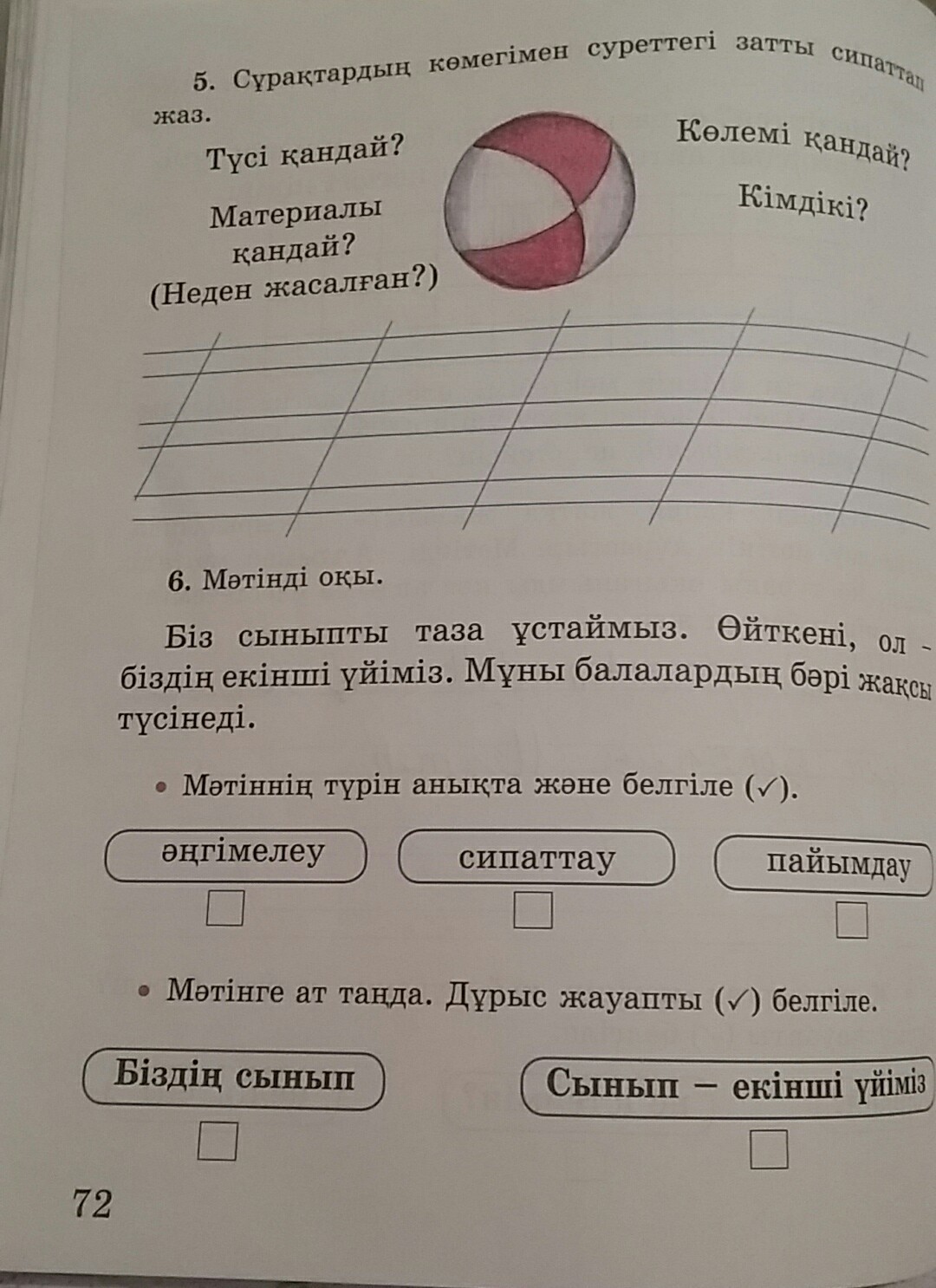 Мысалы:Бұл менің добым оның түсі қызыл мен ақ.Материалы резина көлемі домалақ.
