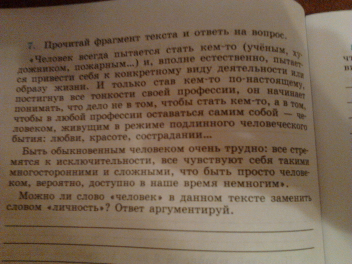 И последнее задание. Человек нельзя заменить на слово личность, т.к. личность предполагает некоторый опыт и социальную зрелость обычного человека. Личность всегда нонконформна, т.е. она вырабатывает собственные нормы поведения, взгляды, мораль, часто не такие, какие приняты в обществе. Поэтому личность в данном тексте как раз именно то, что НЕ является обыкновенным человеком. Быть просто человеком может только ребенок, т.к. у него отсутствует социальный и экономичеко-правовой опыт межличностного взаимодействия в обществе и государстве.