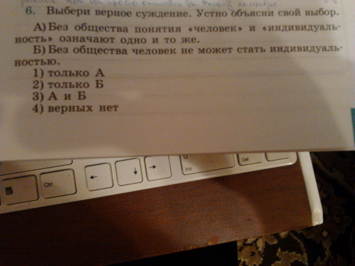 4. Верных ответов нет. Объяснение первого: "без общества понятия человек и индивидуальность означают одно и то же". Это неверно, т.к. в до образования людьми общества, т.е. еще в начале появления Человека Разумного (Homo sapiens) человек был человеком, т.е. состоявшимся, эволюционизировавшим биологическим видом. Ну, а индивидуальность имеется у каждой особи биологического вида, ведь ты можешь определить любого знакомого человека или домашнее животное среди других. У кого-то длинные волосы, большой рост, маленький размер ступни и так далее.
