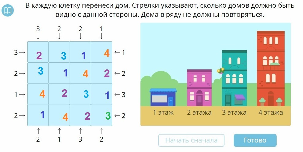 Начинать расстановку с 3-х крайних клеток, для которых указано, что с данной стороны видно 1 дом - очевидно. что это 4-х этажный дом. Оставшиеся 13 клеток заполнять, сообразуясь с условиями задачи: при переносе каждого дома сразу делать проверку в 4-х направлениях.