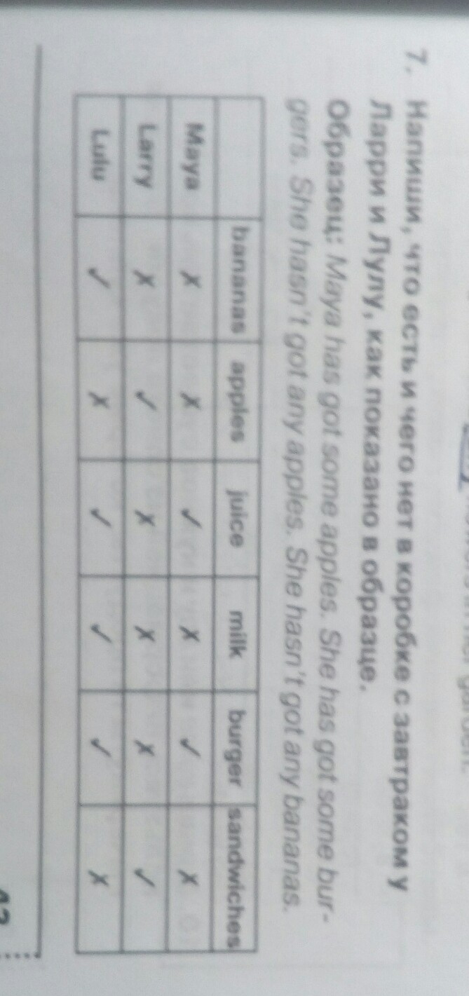 Larry has got some apples. He has got some sandwiches. He hasn't got any bananas. He hasn't got any juice and milk. He hasn't got any burger.