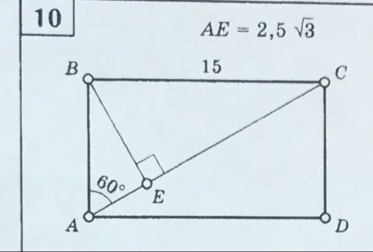 АВ - гипотенуза, АЕ - катет, лежащий против угла в 30°, он равен половине гипотенузы. Таким образом, гипотенуза АВ в 2 раза больше катета АЕ, то есть АВ = 2 · 2,5√3 = 5√3.