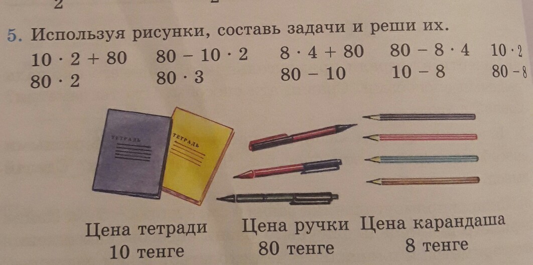 на 1 рисунке идет 2 тетради цена тетради 10 тенге.