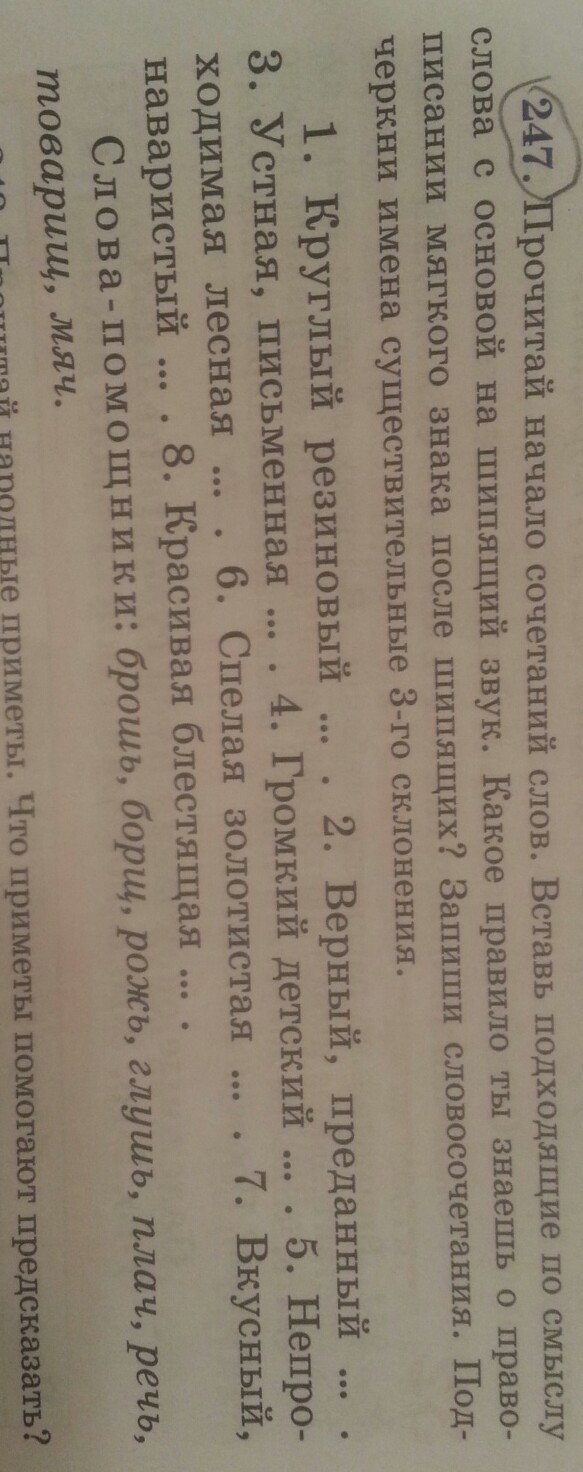 Прочитай начало сочетаний слов.Вставь подходящие по смыслу слова с основой на шипящий звук.Какое правило ты знаешь о правописании мягкого знака после шипящих? Запиши словосочетания.