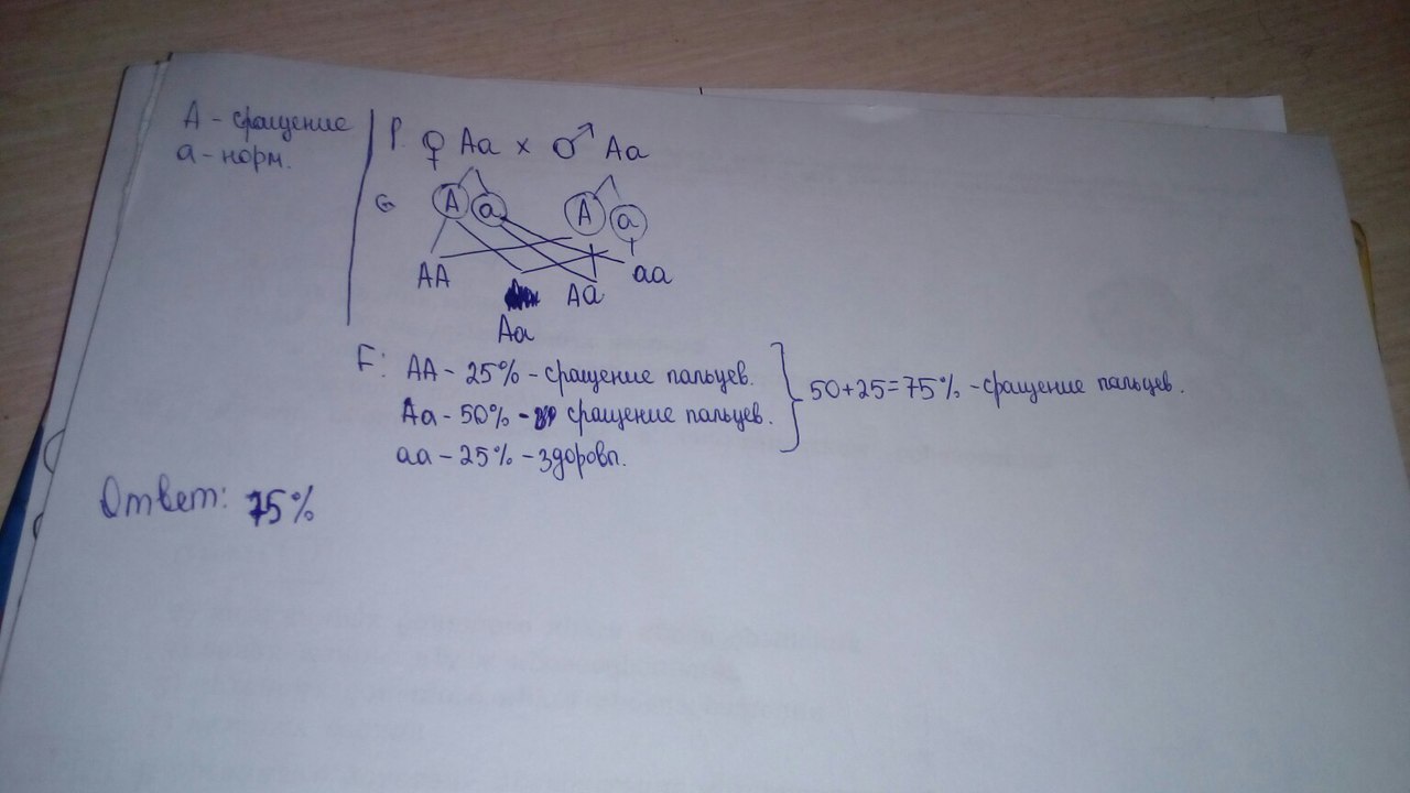 Сращение пальцев наследуется как доминантный признак . какова вероятность рождения детей со сросшимися пальцами в семье где оба родителя гетерозиготны