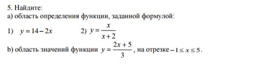 displaystyle 1) y=14-2x \ \ D(y)= ( - infty ; + infty) \ \ \ 2)y= frac{x}{x+2} \ \ x+2 = 0 \ \ x=-2 \ \ D(f) = ( - infty ; -2) cup (-2 ; infty) \ \ \ y= frac{2x+5}{3} , -1 leq x leq 5 \ \ y= frac{2*(-1)+5}{3} =1 \ \ y =frac{2*5+5}{3} =5 \ \ E(y) = [1; 5] , -1 leq x leq 5