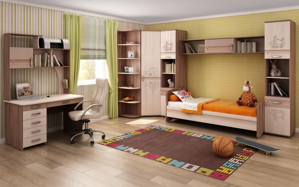 В комнате изображенная на картинке находится стол рядом есть стул. На полу расположен красивый коврик. На кровате есть игршка а рядом есть шкафы. Около стула есть окно с зелеными шторами. В комнате имеется баскетбольный мяч и скейтборт. Комната большая уютная и красивая