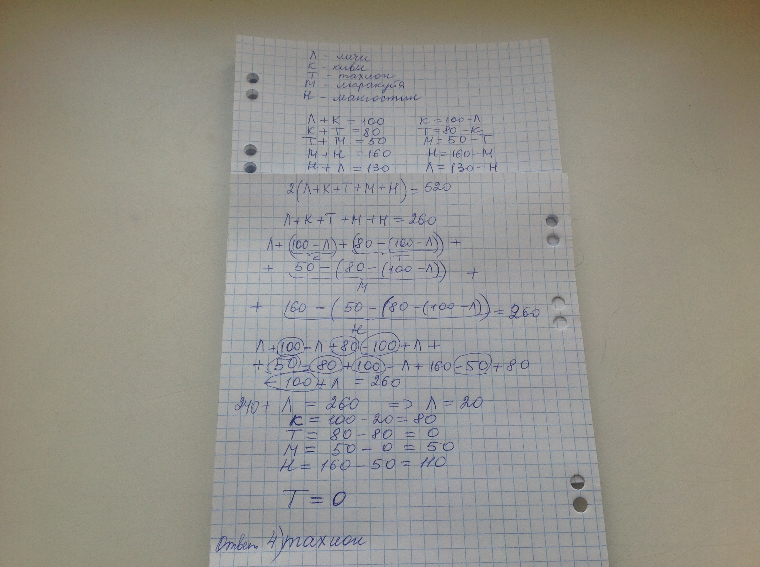 Личи и киви вместе весят 100 г, киви и тахион - 80 г, тахион и маракуйя - 50 г, маракуйя и мангостин - 160 г, мангостин и личи вместе весят 130 г. Что из них весит меньше всего? Выберите один из вариантов ответа.
