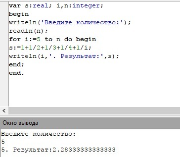 составить на паскале программу для вычисления суммы ряда:s=1+1/2+1/3+1/4+....1/n число n вводится с клавиатуры. протестировать программу для n=1, n=2, n=4, n=6. правильность ответов проверить с помощью калькулятора.