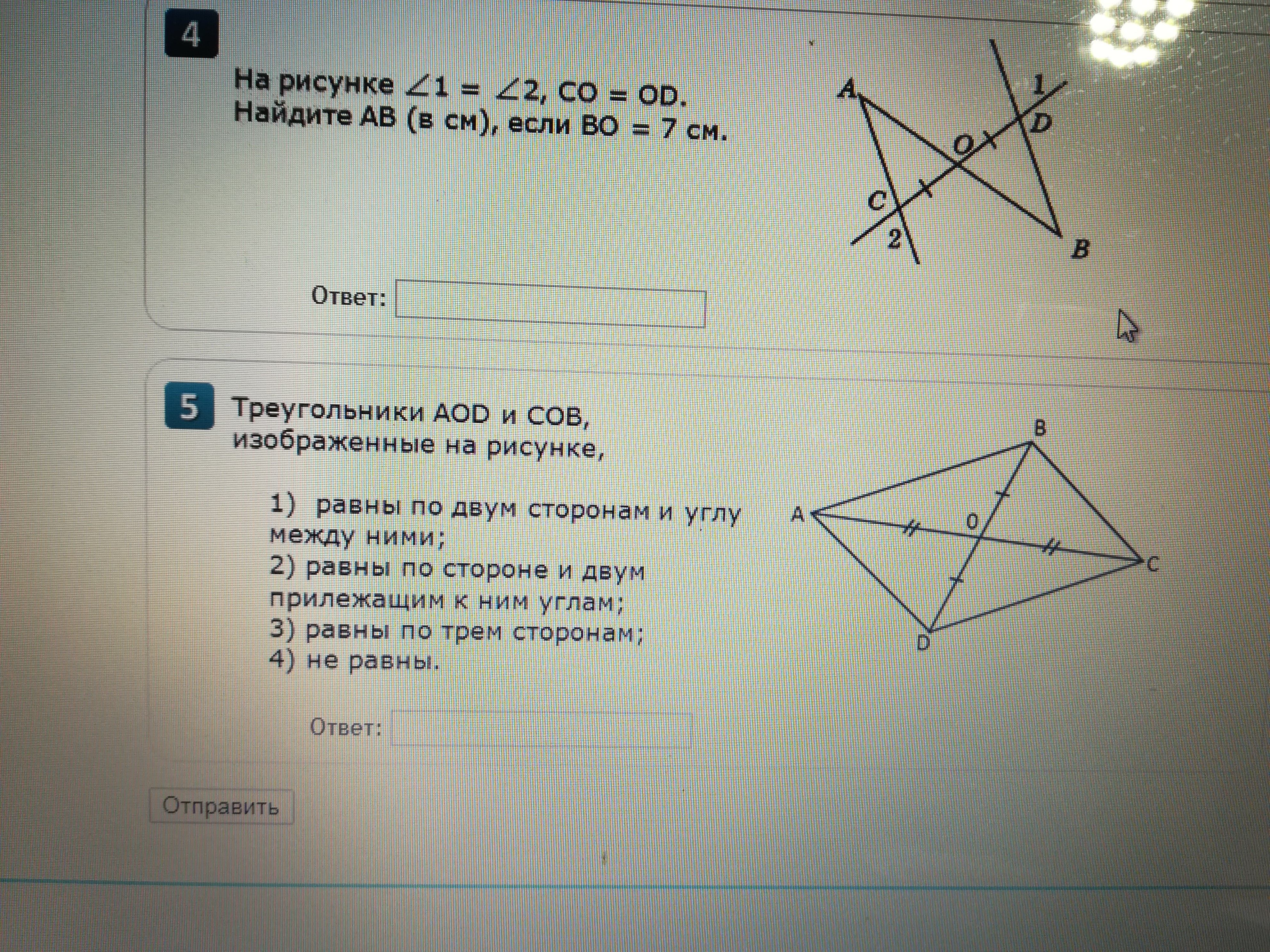 Угол 1и угол ОДВ равны как вертикальные,угол 2 и АСО тоже,т.о. углы ОДВ и АСО равны.Углы АОСи ДОВ равны как вертикальные.СО=ОД по условию.По второму признаку равенства треугольников(сторона и дваприлегающихугла) треуг.САО и ДВО равны.Значит стороны АО и ВО равны.АО=ВО=7см.АВ=АО+ВО=7+7=14 см