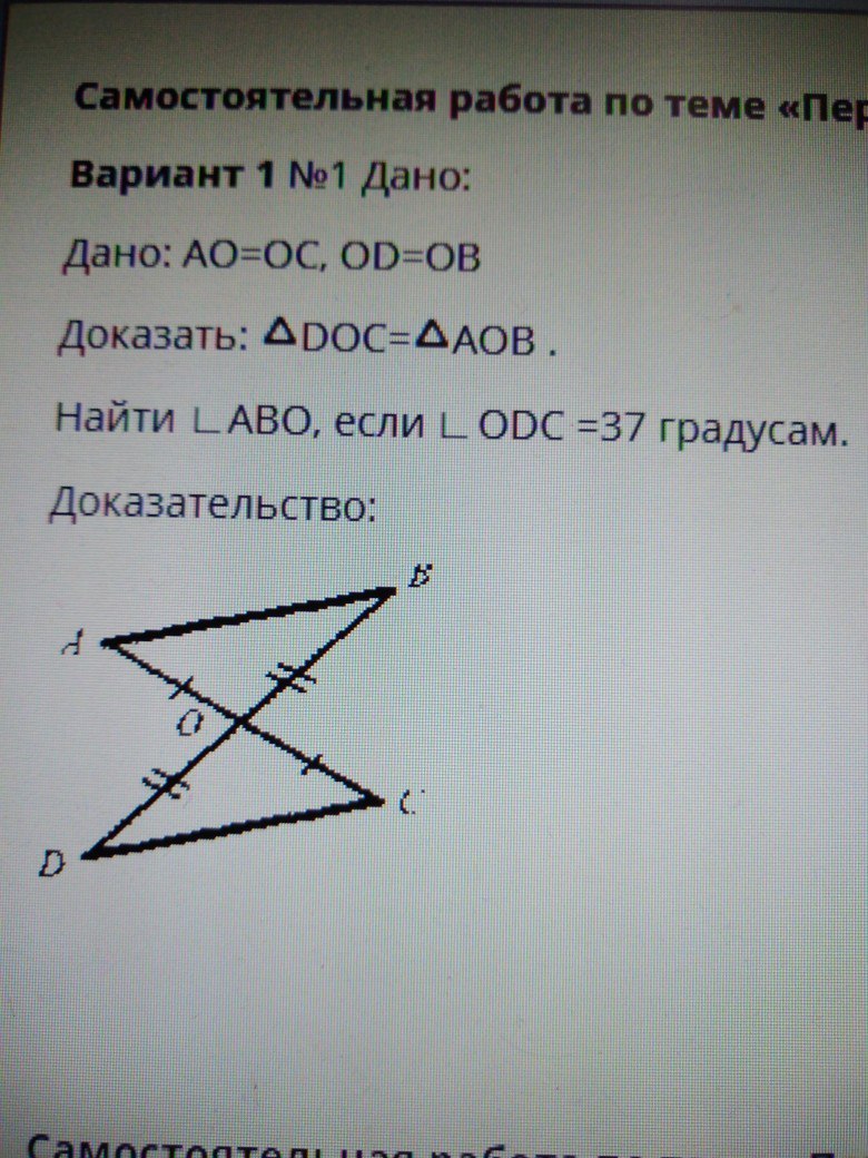 Треугольники АОВ=DOC первому признаку равенства треугольников т. к. AO=OC,OD=OB, уголDOC=AOB т. к. они вертикальные углы.