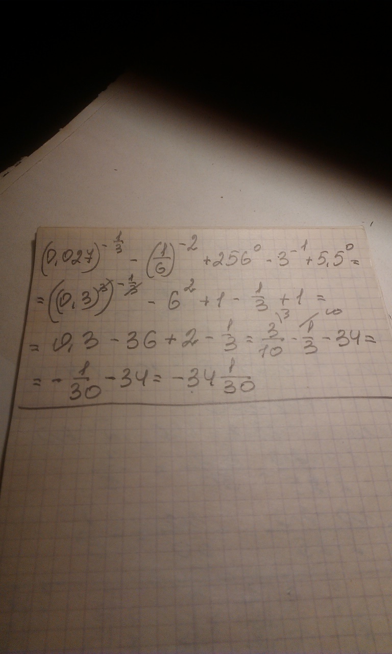0,027⁻¹/₃ - (1/6)⁻² + 256⁰ - 3⁻¹ + 5,5⁰