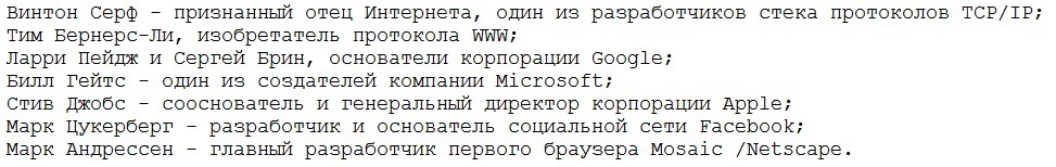 Винтон Серф;Тим Бернерс-Ли; Ларри Пейдж и Сергей Брин;