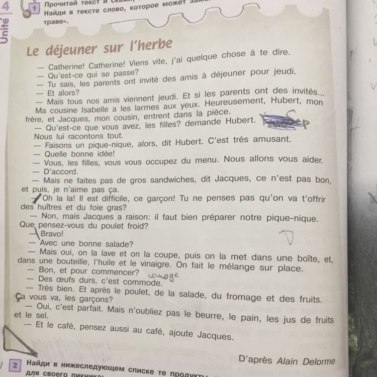 Обед на траве, чтобы рассказать вам, Кэтрин! Скорее скоро, а? на обед в четверг. Знаете, родители приглашали друзей. И что? Четверг. И если у родителей есть гости, Но все наши друзья приходят. К счастью, у Хьюберта, у моей двоюродной сестры Изабель есть слезы на глазах. брат, и Жак, мой двоюродный брат, вошли в Юбера. Что ты, девочки? Мы сказали ему все. Хьюберт, это очень смешно. пикник, тогда, скажите, что хорошая идея принять меню. Мы поможем вам, девочки, вы согласны. Но не делайте больших бутербродов, сказал Жак, это нехорошо. и тогда, не нравится. О, мой! Это сложно, этот мальчик! Разве вы не думаете, что мы предложим вам устрицы и фуа-гра? Нет, но Жак прав: мы должны подготовить наш пикник. Что вы думаете о куриной курице? Поздравляем! С хорошим салатом? в да, он мыть и вырезать, затем положить в коробку, и, ну, бутылку, масло и уксус. Мы смешаемся на месте. и начать? woge Жареные вареные яйца, это удобно, это нормально И после курятины, салата, сыра и фруктов. ты собираешься, ребята? и да, это прекрасно. Но не забудьте масло, хлеб, соль фруктового сока. кофе, подумайте о кофе, добавляет Жак. Согласно Alain Delorme AUMA caoer 3AKPblTb