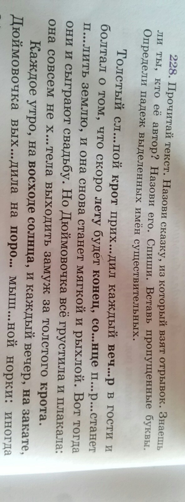 Толстый слепой крот (И.п) приходил каждый вечер(В.п) в гости и болтал о том,что скоро лету(Д.п) будет конец,солнце(И..п) перестанет палить землю , и она снова станет мягкой и рыхлой.Вот тогда они и сыграют свадьбу.Но Дюймовочка всё грустила и плакала: она совсем не хотела выходить замуж за толстого крота(В.п)
